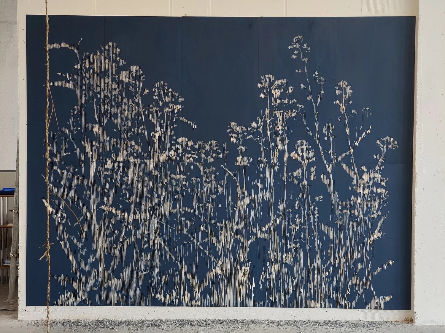 Brassica Junea ( 2025 ) is a site-specific carving featuring imagery of the plant of the same name. It is rendered in reverse out of a dark blue background. Straight lines of varying thicknesses coalesce to form an image. The mark-making is both delicate and aggressive. These tensions reflect the dynamics of healing and ecological violence associated with this plant. The plant is capable of absorbing heavy metals such as lead, cadmium and uranium from contaminated soil. It is commonly used in phytoremediation. This is a process whereby plants are used to heal land polluted by industrial practices, including mining and military activity. Moving between the registers of nature and culture, the plant can be thought of as both a remedy and a poison, its presence signalling destructive environmental practices yet, paradoxically, also embodying the capacity of plant life to heal.