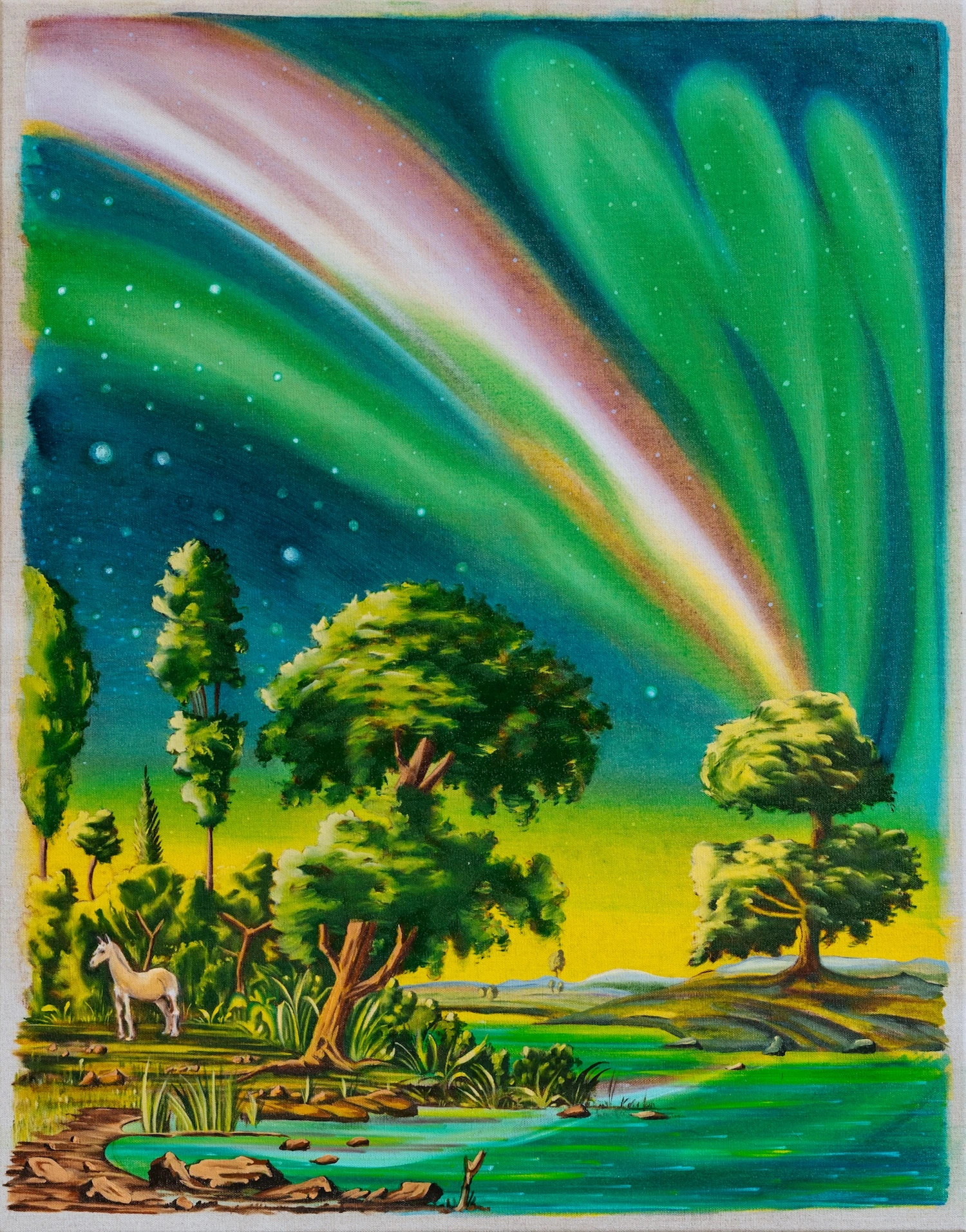 Empire draws visual and conceptual influence from the mythology of the so-called “New World”—the 19th-century vision of the American frontier as an open, boundless, and bountiful landscape. Through hyper-detailed landscapes rendered in vibrant colour and fine brushwork, Eager Maher interrogates the visual tropes used to sell this dream of limitless opportunity and manifest destiny.