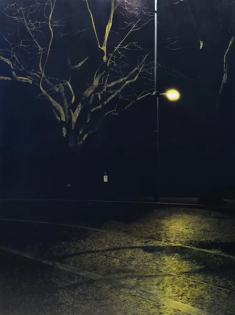 I’ve lots of questions. Is it always a photograph to begin with? Yes. Must it be immediately local? No. Is it usually night-time? Yes, or dawn. What about people: are there never people? No people. But there’s always figure and ground.