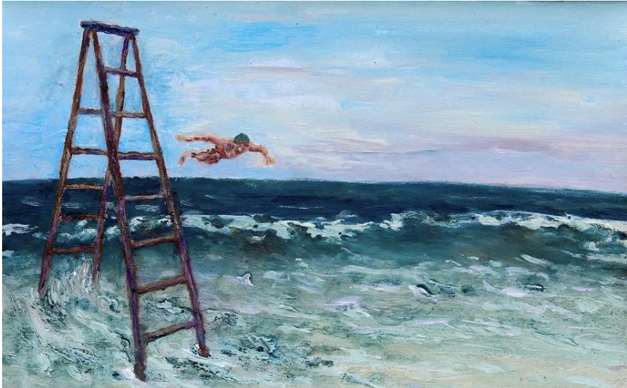 Daniel Lipstein, Self Portrait with a Pet and a Bathtub, (Climb 8), oil on linen, 71x85 cm